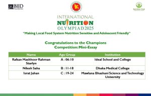 গত ২১ ডিসেম্বর, রবিবার, আইএনও তাদের অফিশিয়াল ফেসবুক পেজে বিভিন্ন ক্যাটাগরিতে বিজয়ীদের নাম ঘোষণা করে। এবারের ইন্টারন্যাশনাল নিউট্রিশন অলিম্পিয়াড ২০২৫ অনুষ্ঠিত হয়