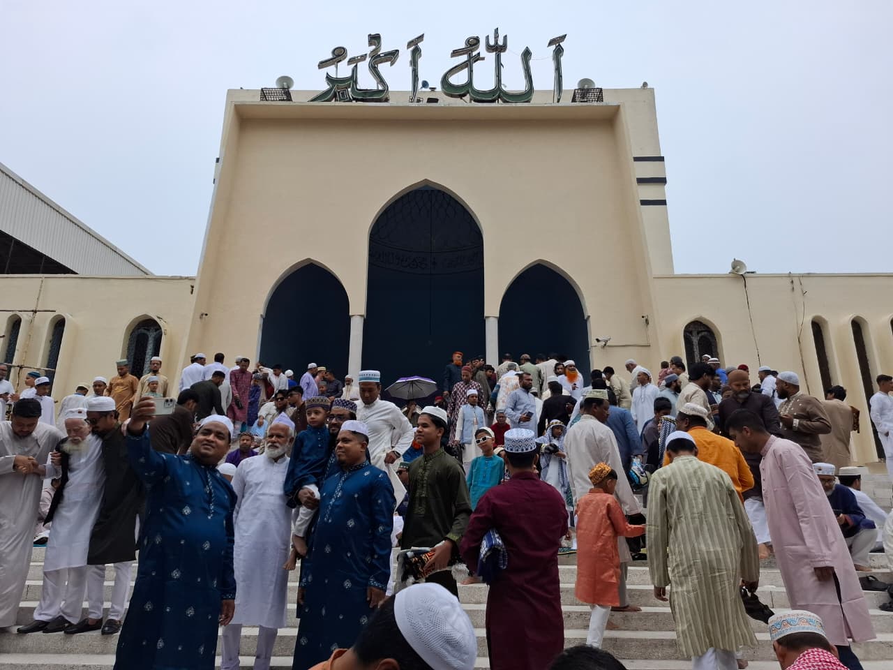নামাজ শেষে মুসল্লিরা একে অপরের সঙ্গে কোলাকুলি করে ঈদের আনন্দ ভাগাভাগি করেন।